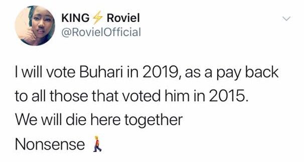In her tweet which has since one viral she wrote: “I will vote Buhari in 2019, as a pay back to all those that voted him in 2015. We will die here together. Nonsense”>